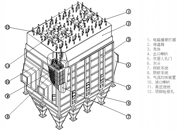 4.维护工作量小:阴阳极振打清灰装置设计布置在除尘器顶部,烟尘中没有运动部件,运行安全可靠、可在线维护、便于管理;