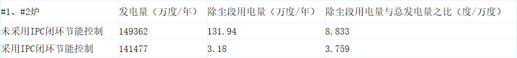 3、该系统通过出口烟道浊度仪反馈信号,实现电除尘器的保效节能闭环控制,不仅提高了除尘效率,而且节约了巨大的电能,为了比较节能效果,我们统计了#1、#2炉除尘段在闭环节能控制前后两个整年的用电电表读数,以及这两年的发电总量数据,如下: